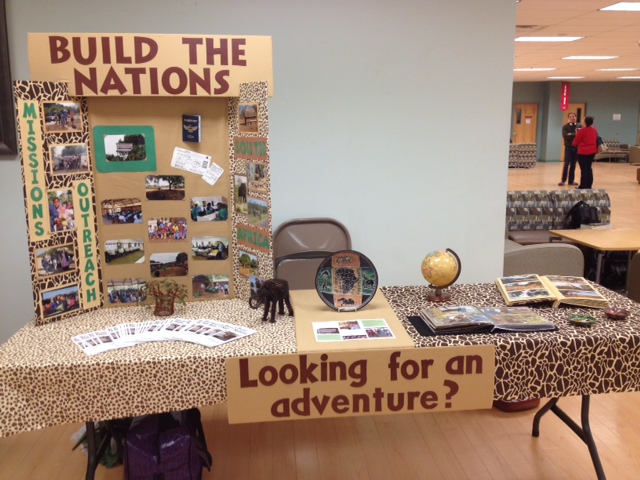 Liberty University’s Global Focus Week has concluded. December and January passed in preparation for the week-long event, and when the week arrived, I set up the display board and arranged the artifacts and brochures with a smile. For weeks, I found myself in my parents’ basement creating a scrapbook displaying the various adventures one will find at the Build the Nations mission base in South Africa. In addition, my friend Amy and I spent hours creating a brochure to place on the table for students to take home and peruse at will, while in the final hours of preparation, my mother and I finished the display board that would serve as the anchor for the advertisement table. Many days were spent creating with glue and paper, as miles of petrol were used in running to various stores to purchase materials and print photographs. All of this culminated in a week on LU’s third floor in the ILRC.